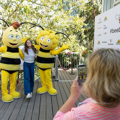 Moderatorin Mona Ameziane mit Biene Maja und Willi beim #beebetter-Award 2023 © René Reiche für Hubert Burda Media