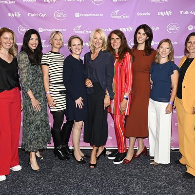 Frauenpower: Aus ganz Deutschland waren die Referentinnen angereist, hier mit Vertretern des BurdaVerlags, der Co-CEO Elisabeth Varn (r.) sowie Miriam Mack, Head of Corporate Health des Europapark Rust (3.v.r.). Zwei ereignisreiche Tage voller neuer Eindrücke, Wissen und Inspiration boten den Teilnehmerinnen und Gästen spannende Impulse für Gesundheit, Wohlbefinden und Strategien für einen selbstbewussten Umgang mit den Wechseljahren © AGENCY PEOPLE IMAGE