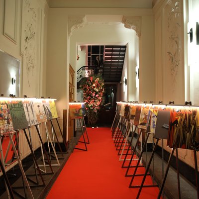 Im Eingangsbereich des Borchardt waren die Werke der 25 Künstler ausgestellt, die für die Jubiläumsausgabe des Focus ihre eigene Titelseite gestaltet hatten. Die Gäste erhielten die 25 Kunstwerke – u.a. von Ai Weiwei, Anselm Reyle, Erwin Wurm, Aino Laberenz, Andreas Mühe und Tobias Rehberger – außerdem im Postkartenformat.