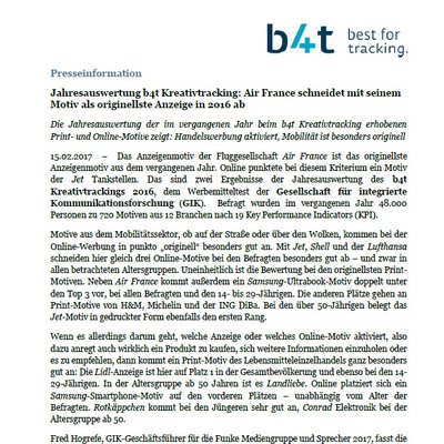 Das Anzeigenmotiv der Fluggesellschaft Air France ist das originellste Anzeigenmotiv aus dem vergangenen Jahr. Online punktete bei diesem Kriterium ein Motiv der Jet-Tankstellen. Das sind zwei Ergebnisse der Jahresauswertung des b4t Kreativtrackings 2016, dem Werbemitteltest der Gesellschaft für integrierte Kommunikationsforschung (GIK). Befragt wurden im vergangenen Jahr 48.000 Personen zu 720 Motiven aus 12 Branchen nach 19 Key Performance Indicators (KPI).