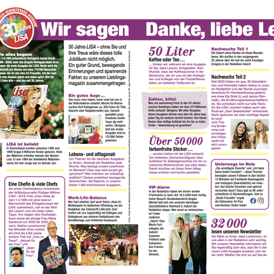 In den 30 Jahren ihres Bestehens hat Lisa über 574 Mio. Exemplare verkauft. Mit allen Rezepten dieser Ausgaben – so hat es die Redaktion errechnet - könnte man über 85 Jahre lang jeden Tag ein anderes Gericht kochen. Heute schmökern im Schnitt über 700.000 Leser:innen pro Woche (MA Ii/2024) in der der Lisa – mit der Reichweite liegt sie mit großem Abstand vor der direkten Konkurrenz namens Laura und Lea. Sehr beliebt sind bei den Leser:innen die Sticker, die es seit geraumer Zeit als Umhefter gibt - bislang waren es rund 50.000 Sticker. Lisa hatte über die drei Jahrzehnte mehrere Chefredakteure an ihrer Spitze, aber nur eine Chefredakteurin, Maria Sandoval (rund 20 Jahre von 2003 bis 2023). 20 Volontär:innen haben bisher in der Lisa-Redaktion ihr journalistisches Handwerk gelernt. Und apropos eigener Nachwuchs – über 40-mal durfte im Redaktionskollegenkreis in den letzten 30 Jahren die Geburt eines Kindes gefeiert werden. Die Marke Lisa entwickelte eine große Strahlkraft, sodass zahlreiche Line-Extensions gegründet wurden, wie etwa Lisa Wohnen & Dekorieren, Lisa Kochen & Backen, oder Lisa Blumen & Pflanzen. Auch außerhalb von Deutschland war das Lisa-Zeitschriftenkonzept ab Mitte der 90er in Lizenzen schnell erfolgreich unterwegs.