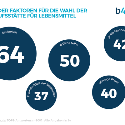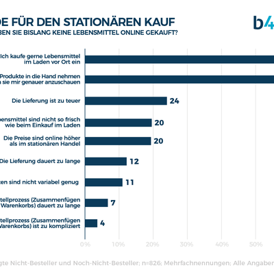 Laut b4p trends kaufen lediglich 3 Prozent der Befragten ihre Lebensmittel bereits regelmäßig online ein. Zwei Drittel der Befragten (63%) ziehen die digitale Alternative zum Supermarkt erst gar nicht in Betracht. Stattdessen schätzen sie die Nähe des Ladens direkt um die Ecke (64%), sie nehmen Produkte gerne in die Hand (57%), wollen teure Lieferkosten vermeiden (24%) und setzen auf die bessere Qualität und Frische der Produkte (20%). Ob Supermarkt oder Discounter spielt hierbei keine Rolle: Im Ranking liegen Supermarkt (77 %) und Discounter (73%) bei den Befragten beinahe gleich auf und werden in der Regel etwa einmal pro Woche besucht. Knapp die Hälfte der Befragten (56%) kauft sogar wöchentlich bei beiden ein.
