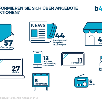 Die meisten Befragten lassen sich dabei klassisch zu Angeboten und Aktionen inspirieren: über Postwurfsendungen (57%) sowie Prospekte oder Anzeigen in Printmedien wie Tageszeitungen (44%). Alternativ informieren sich die Kunden direkt im Laden (42%). Online versorgen sich vor allem junge Menschen im Alter von 14 bis 29 Jahren mit Infos über Rabatte, Aktionen und Sonderangebote (38%), insgesamt sind es 27 Prozent. Insgesamt 23 Prozent der 14- bis 29-Jährigen folgt einem oder mehreren Händlern über die Social-Media-Kanäle hinweg. Spezielle mobile Apps der Lebensmitteleinzelhändler nutzt diese Altersgruppe hingegen eher selten (17%).