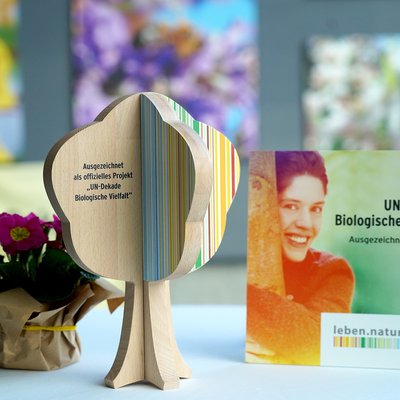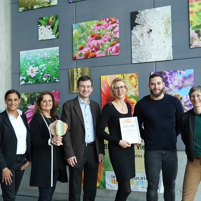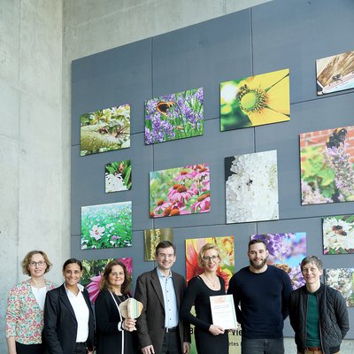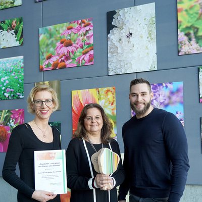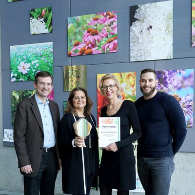 Vetter überreichte Urkunde, Auszeichnungsplakette und einen „Vielfalt-Baum“ als Trophäe an die Initiatoren von #beebetter.
