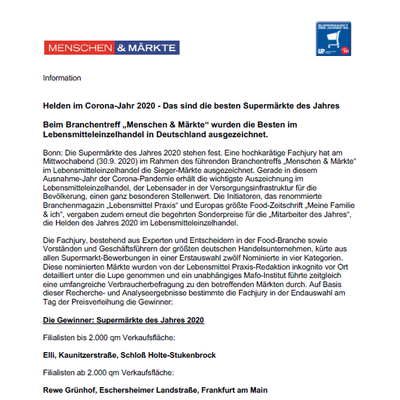 Der wichtigste Preis im Lebensmitteleinzelhandel ist in diesem Jahr einmal mehr eine ganz besondere Ehrung. Denn die Märkte und ihre Mitarbeiter haben gerade in der Zeit des Lockdowns im Frühjahr eindrucksvoll unter Beweis gestellt, wie essentiell ihr Einsatz, über jegliche Job-Description hinaus, und ihr verlässliches und qualitativ hochwertiges Versorgungssystem für die Bevölkerung sind. Wie auch in vielen anderen infrastrukturell unverzichtbaren Branchen konnten sich die Mitarbeiter in den Supermärkten nicht ins Home Office zurückziehen, sondern zeigten vor Ort in den Märkten großes Engagement und weit mehr als das.