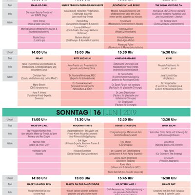 „The Glow must go on“: Die Ärztin und international erfolgreiche Beauty-Unternehmerin Dr. Barbara Sturm referiert über moderne Hautpflege und „anti-entzündlichen“ Lifestyle. Topmanagerin und Powerfrau Tina Müller, CEO von Douglas spricht über die Erfolgsrezepte von Beauty-Start-ups. Boris Entrup und GNTM-Gewinnerin Vanessa Fuchs teilen die neuesten Make-up- und Frisurentrends von den internationalen Runways und Red Carpets. Stilikone Riccardo Simonetti spricht mit Erik Jäger, dem liebsten Fitness-Coach der Prominenten, über Bodyshaping. Weitere Bühnentalks drehen sich um die Themen Ernährung, Entspannung, Schlaf, Hautpflege, Fitness, Schönheit und die neuesten Treatments in der Schönheitsmedizin, insbesondere solche, die nicht operativ erfolgen.