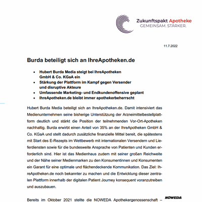 Hubert Burda Media baut als Gründungsmitglied des "Zukunftspakt Apotheke" sein Engagement im Bereich der Erschließung der digitalen Patient Journey weiter aus und beteiligt sich an IhreApotheken.de (www.ia.de). Burda erwirbt 35 Prozent der Anteile an der Arzneimittelbestellplattform IhreApotheken Gmbh & Co. KGaA, stellt zusätzliche finanzielle Mittel für die Weiterentwicklung von IhreApotheken.de bereit und stärkt damit nachhaltig die Position der teilnehmenden Vor-Ort-Apotheken.