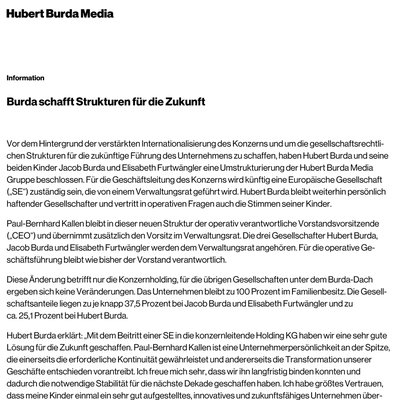 Vor dem Hintergrund der verstärkten Internationalisierung des Konzerns und um die gesellschaftsrechtlichen Strukturen für die zukünftige Führung des Unternehmens zu schaffen, haben Hubert Burda und seine beiden Kinder Jacob Burda und Elisabeth Furtwängler eine Umstrukturierung der Hubert Burda Media Gruppe beschlossen. Für die Geschäftsleitung des Konzerns wird künftig eine Europäische Gesellschaft („SE“) zuständig sein, die von einem Verwaltungsrat geführt wird. Hubert Burda bleibt weiterhin persönlich haftender Gesellschafter und vertritt in operativen Fragen auch die Stimmen seiner Kinder.