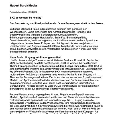 Um für dieses wichtige Thema zu sensibilisieren, fand am 11. und 12. September 2024 der hochkarätig besetzte Fachkongress „BXX be women, be healthy” zum Thema Frauengesundheit in Kooperation mit dem Europa-Park in Rust statt (https://zukunftspakt-apotheke.de/events/womenx/). BXX ist eine gemeinsame Initiative des BurdaVerlags und IhreApotheken.de, unterstützt von My Life und Freundin. Die Initiatoren von BXX läuten mit reichweitenstarken, multimedialen Aufklärungsreihen eine neue, kommunikative Ära im Umgang mit Themen der Frauengesundheit ein. Ziel ist es, das Know-how von Expert:innen aus Medizin und Apothekerschaft mit der Medienpower von Burda zu verknüpfen, um dem zunehmenden Bedürfnis von Frauen nach verständlichen Informationen, Beratung und Therapie gerecht zu werden.