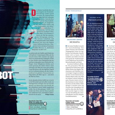 Das SerienMagazin stellt die kommenden Highlights aus den Bereichen Comedy, Drama, Thriller, Action, Fantasy, Sci-Fi, Horror und Kids vor. Neben ausführlichen Kritiken zu den einzelnen Formaten können sich Serien-Fans auf exklusive Interviews mit den Stars und Machern freuen. In der ersten Ausgabe des Magazins präsentieren die beiden Redaktionen von Cinema und TV Spielfilm auf 124 Seiten mehr als 100 Formate – kritisch, unabhängig und kompetent bewertet. Der Leser gewinnt unter anderem Einblicke in die Drehorte von „Games of Thrones“ und wird hinter die Kulissen der Erfolgsserie geführt. Zudem wird das Set der Netflix-Serie „The Alienist – Die Einkreisung“ besucht und verraten, was hinter der gigantischen Einkaufsoffensive des Streaming-Diensts steckt.