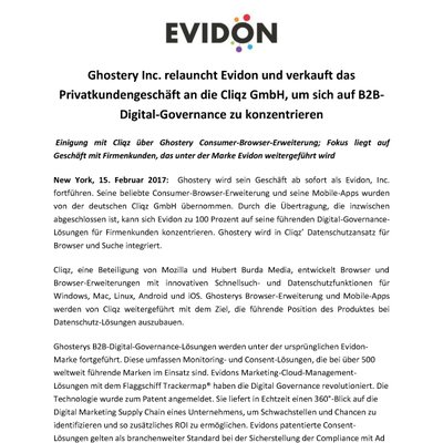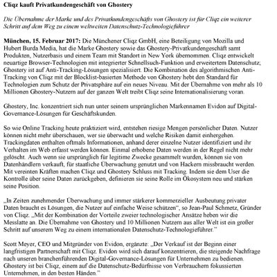 Das Münchener Start-up Cliqz, eine Mehrheitsbeteiligung des international agierenden Medien- und Technologieunternehmens Hubert Burda Media, hat die Anti-Tracking- und Mobile Apps-Sparte des amerikanischen Unternehmens Ghostery gekauft. Ghostery mit Sitz in New York City ist auf Anti-Tracking spezialisiert und zählt mehr als 10 Millionen Nutzer weltweit. Mit dem Kauf der Firma treibt Cliqz seinen Internationalisierungskurs voran und eröffnet sein erstes Büro in den USA.