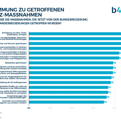 Knapp die Hälfte der Bevölkerung ist der Meinung, dass die deutsche Regierung rechtzeitig Maßnahmen ergriffen hat, um das Corona-Virus einzudämmen (49%). Während die Altersgruppe ab 50 Jahren mit 54% mehrheitlich damit konform geht, fällt die Zustimmung bei den 30 bis 49-Jährigen mit 43% jedoch deutlich geringer aus. Allerdings ist die Mehrzahl der Befragten der Meinung, dass die zum Zeitpunkt der Befragung aktuellen Maßnahmen angemessen sind. Aber es gibt auch Ausnahmen: So werden zum Beispiel vor allem die Kontaktsperre im familiären Umfeld (21%), Ladenschließungen (20%) sowie die Schließung von Spielplätzen (16%) von den Befragten als übertrieben eingeschätzt. Die größte Unzufriedenheit zeigt sich bei der Kontrolle von Einreisenden aus dem Ausland: 26% sind der Meinung, dass hier ungenügend oder zu spät eingeschritten wurde.
