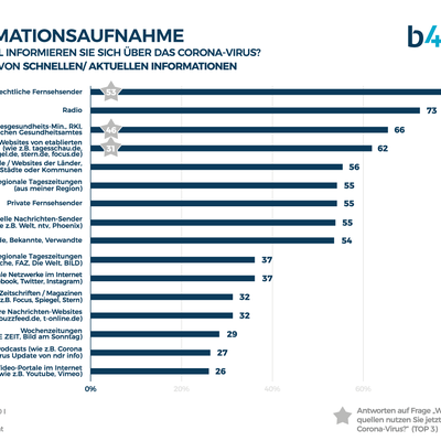 Bei Hintergrundinformationen sind ebenfalls offizielle Websites (47%) sowie die öffentlich-rechtlichen Fernsehsender (44%) und Nachrichten-Websites der etablierten Medienmarken (39%) gefragt. Gleich dahinter folgen aktuelle Magazine wie zum Beispiel der Spiegel, Stern und Focus (37%) sowie Nachrichtensender wie WELT und ntv (37%). Diese Medien sind auch die meistgenannten auf die Frage, welche Medien aus Sicht der Befragten insgesamt am tiefgreifendsten und umfassendsten über das Corona-Virus informieren. Soziale Netzwerke hingegen genießen derzeit mit 6% nur wenig Vertrauen als Medienkanal.