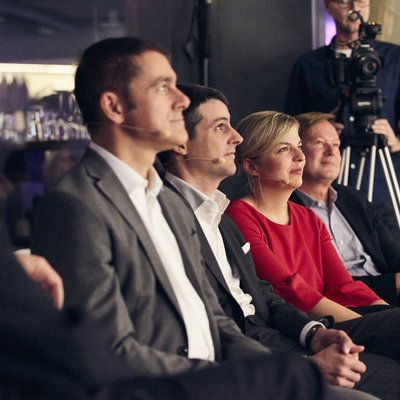 Auf der Bühne: Paul-Bernhard Kallen, CEO Hubert Burda Media, die bayerische Grünen-Chefin Katharina Schulze, Stefan Vilsmeier, der mit Big Data in seinem Unternehmen Brainlab die Gehirnchirurgie revolutioniert hat, und Marc Al-Hames, Geschäftsführer der Cliqz GmbH, der mit dem gleichnamigen Browser das Internet sicherer machen will. Politik, Medienmacher, IT-Startups. Der Journalist und Autor Dominik Wichmannn führte durch den Abend.