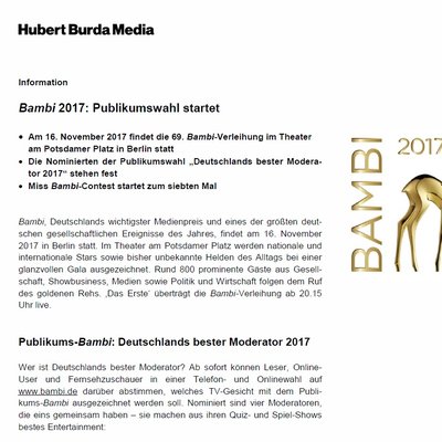 Auch in diesem Jahr haben Leser, User und Fernsehzuschauer die Möglichkeit, in einer Telefon- und Onlinewahl Deutschlands wichtigsten Medienpreis zu vergeben und darüber abzustimmen, welches TV-Gesicht mit dem Publikums-Bambi als „Deutschlands bester Moderator“ ausgezeichnet werden soll. Ins Rennen gehen vier Persönlichkeiten, die eines gemeinsam haben – sie machen aus ihren Quiz- und Spiel-Shows bestes Entertainment: Kai Pflaume, Johannes B. Kerner, Elton und Frank Buschmann. Gevotet werden kann ab sofort bis zum 16. November, 21.30 Uhr. Unter allen Teilnehmern wird ein E 200 Cabriolet mit AMG Line von Mercedes-Benz verlost.