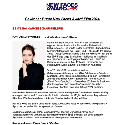 In drei Kategorien hatte die hochkarätige und teils neubesetzte New Faces Award Film-Jury abgestimmt. Über ihren ersten Panther durfte sich Katharina Stark (25) freuen, die den Award von Laudatorin und Vorjahresgewinnerin Bayan Layla und unter tosendem Applaus als „Beste Nachwuchsschauspielerin“ überreicht bekam, für ihre Rolle der Dolmetscherin Eva Bruhns in der erfolgreichen Disney+-Produktion „Deutsches Haus“. Das Publikum jubelte ebenfalls, als Anna Roller (31) den New Faces Award für ihr Hochschulabschlussprojekt „Dead Girls Dancing“ als „Besten Debütfilm“ von Laudatorin und Jury-Mitglied Caroline Link erhielt. Laudator Tim Oliver Schultz kürte anschließend Zethphan Smith-Gneist (22) als „Besten Nachwuchsschauspieler“ für seine Rolle als Cem in der Folge „Zeit Verbrechen: Deine Brüder“. In der Kategorie „Disruptive Mind by glo“ hat erstmals allein das Publikum entschieden. Drei Wochen hatte die Community unter newfacesaward.de mit über 10.500 Stimmen gevotet. Durchgesetzt hat sich Cindy Klink (27), die als gehörlose Deaf Performerin und Schauspielerin nicht nur das Publikum, sondern auch Laudatorin und Model Kim Hnizdo begeistert. Durch die emotionsgeladene Award Show im vollbesetzten Delphi Filmpalast in Berlin führte Moderatorin und Schauspielerin Thelma Buabeng.