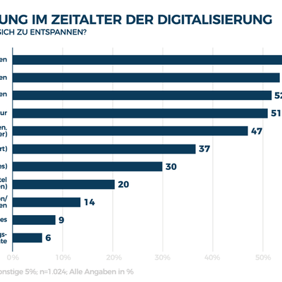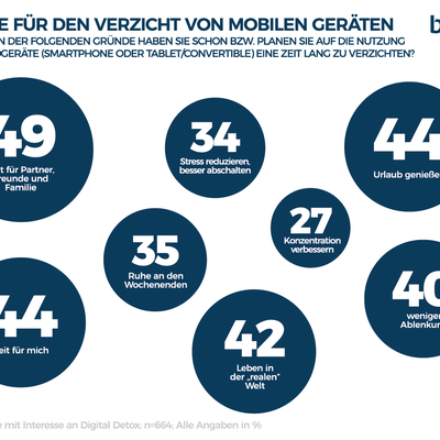 Mehr Zeit für die Familie (49%) und für sich selbst (44%) haben: Das sind die Top-Gründe fürs „Abschalten“. 42 Prozent der Mobile-Abstinenzler möchten dadurch stärker in der „realen“ Welt leben. Allerdings: Eine Woche ohne Smartphone auszukommen, können sich dann doch „nur“ 36 Prozent vorstellen. Zum Vergleich: 84 Prozent könnten auf Fast Food und 83 Prozent auf Alkohol verzichten. Und was hilft den gestressten Deutschen im Zeitalter der Digitalisierung generell zu entspannen? Laut b4p trends sind dies Musik hören (65%), Freunde treffen (53%), in die Natur (51%) oder medial Offline gehen – unter anderem zum Beispiel mit Lesen (47%).