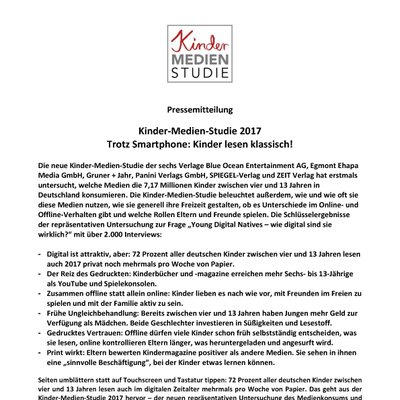 Die Kinder-Medien-Studie der sechs Verlage Blue Ocean Entertainment AG (Burda), Egmont Ehapa Media GmbH, Gruner + Jahr, Panini Verlags GmbH, Spiegel-Verlag und Zeit Verlag hat erstmals untersucht, mit welchen Medien sich die 7,17 Millionen Kinder zwischen vier und 13 Jahren in Deutschland beschäftigen. Die Studie beleuchtet außerdem, wie und wie oft sie diese Medien nutzen, wie sie generell ihre Freizeit gestalten, ob es Unterschiede im Online- und Offline-Verhalten gibt und welche Rollen Eltern und Freunde spielen.