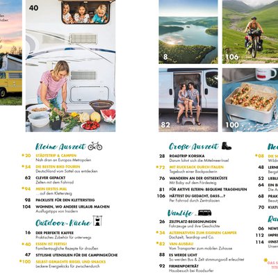 Zu den Themen der Erstausgabe von Einfach los zählen u.a.: „Städtetrip & Campen“, „Die besten Bike-Touren“, „Essen ist fertig“ mit familientauglichen Rezepten für draußen, „Selbstgemachte Riegel und Snacks“ für zwischendurch, „Mit dem Rucksack durch Italien“ – das Tagebuch einer Backpackerin, „Wandern an der Ostseeküste“ mit Baby auf dem Fördesteig, „Alternativen zum eigenen Camper“, wie Dachzelt, Teardrop & Co, „Van-Ausbau“ oder „Die schönsten Nationalparks“ – Wildnis direkt vor der Haustür vom Bayerischen Wald bis zur Müritz-Region.