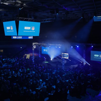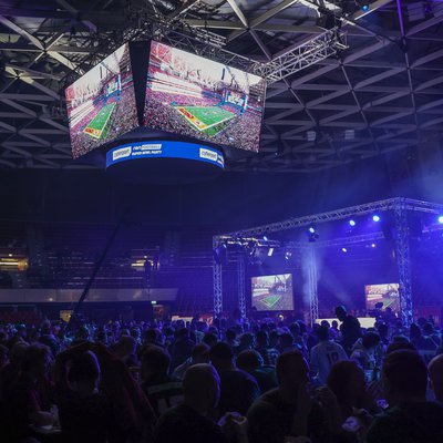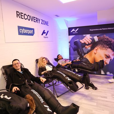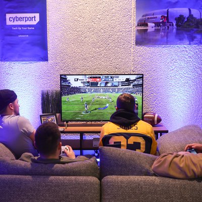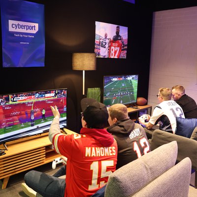 Cyberport veranstaltete die exklusive Cyberport ran Football Super Bowl Party in München gemeinsam mit der Sport-Fernsehsendung ran. Bevor es mit der Show losging, boten verschiedene Cyberport Zones im Audi Dome die Möglichkeit, spannende Technik zu erleben: In der Cyberport Recovery Zone powered by Hyperice drehte sich alles rund um das Thema Regeneration nach dem Sport. Fans konnten Massagepistolen und Bein-Massagesysteme live austesten und dabei entspannen wie NFL Quarterback und Most Valuable Player Patrick Mahomes. Wer mehr Action brauchte und sich selbst ins Spielgeschehen werfen wollte, fand in der Cyberport Gaming Zone alles, was das Gamer-Herz begehrt: Bei einem NFL Madden Spiel auf der Xbox Series S konnten sie gegeneinander antreten.