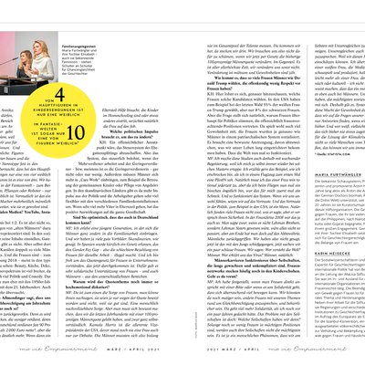„Auch in Deutschland, Europa, oder den USA gibt es nach wie vor in Sachen Gleichberechtigung viel Luft nach oben“, sagt Ma Vie-Chefredakteurin Maria Sandoval. „Und das vergangene Corona-Jahr ist hier in mancher Hinsicht geradezu eine unschöne Offenbarung gewesen“, so Sandoval. Maria Furtwängler halte eine Quote für hilfreich, erklärt sie im Interview: „Man muss sich bewusst machen, dass wir die letzten Jahrhunderte mit einer 100-prozentigen Männerquote gelebt haben, und zwar ganz selbstverständlich. Kamala Harris ist die allererste Vizepräsidentin der USA, davor stand noch nie eine Frau auch nur zur Debatte. Die Männer mussten sich also bislang nie im Gesamtpool der Talente messen. Da kommen wir her, da stecken wir drin. Wir brauchen uns also nicht dafür zu schämen, wenn wir jetzt per Gesetz die bisherige 100-prozentige Männerquote verändern. Im Gegenteil. Es ist aller, allerhöchste Zeit, wir verändern uns sonst nicht.“