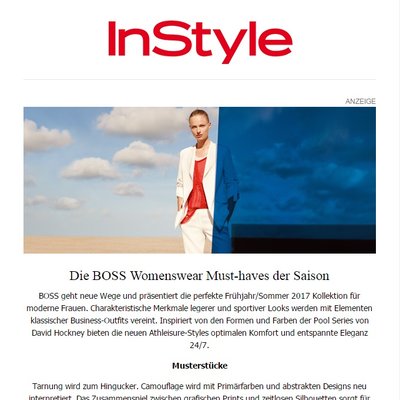 Ergänzt wird das Editorial Shooting mit einem dreiteiligen Native Advertising-Paket: Harper’s Bazaar präsentiert auf seiner Website die Teile aus der aktuellen Kollektion und versieht sie mit sogenannten Shopping Widgets, die direkt in den Hugo Boss-Onlinestore verlinken und so zum Abverkauf beitragen. Für optimale Aufmerksamkeit sorgt das Making-of-Video vom Editorial Shooting, das Harper’s Bazaar und Bunte.de auf ihren digitalen bzw. Facebook-Kanälen pushen. Das Video wurde bisher über 60.000 Mal angeklickt. Gleichzeitig verschicken Elle, Instyle und Bunte Stand-alone-Newsletter mit Verlinkung auf den Hugo Boss-Onlinestore.