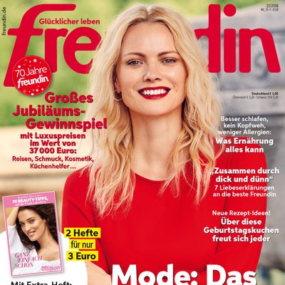 Am 19. September 2018 erscheint die Jubiläumsausgabe von Freundin mit Model Franziska Knuppe auf dem Cover. Die Künstlerin Judith Milberg hat eigens für das Freundin-Jubiläum die Kunstedition „Moments in Time“ erschaffen. Sie besteht aus drei verschiedenen Kunstdrucken, in 70er-Auflage, von der Künstlerin jeweils manuell individualisiert und signiert. Zahlreiche weitere Jubiläumsprodukte, vom Dirndl über den Koffer bis zur Halskette und zum Jubiläums-Hoody gibt es zu kaufen und zu gewinnen. Und nicht zuletzt lädt Freundin ihre Leserinnen auf eine Zeitreise ein: das Jubiläumsbuch mit dem Titel „Petticoat, Dauerwelle, Schulterpolster – Mit Freundin auf Zeitreise“ (Prestel Verlag, 30 Euro) erscheint im Oktober pünktlich zur Frankfurter Buchmesse und zeigt Highlights aus sieben Jahrzehnten. Die Jubiläumsausgabe wird in Print, Online, TV, Funk und am POS beworben.