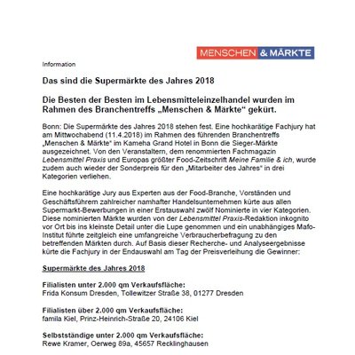 Meine Familie & ich und das Fachmagazin Lebensmittelpraxis haben gestern beim fünften, gemeinsam veranstalteten Handelskongress Menschen & Märkte mit der Preisverleihung zum „Supermarkt des Jahres 2018“ in Bonn erneut eine Lanze für hohe Qualität & ausgezeichneten Service im Lebensmitteleinzelhandel (LEH) gebrochen. Das führende Branchen-Event ist eine innovative Informations- und Diskussionsplattform zu den aktuellen und zukünftigen Herausforderungen im LEH und der Entwicklung der Konsumentenwünsche.