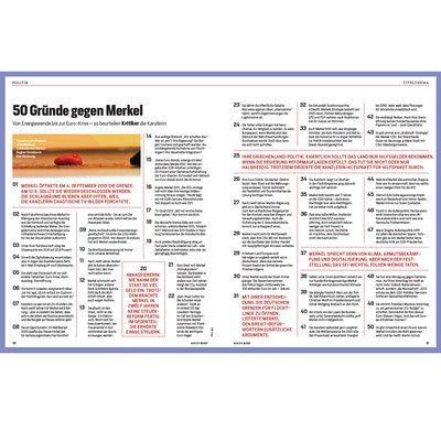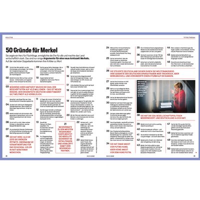 Das Nachrichtenmagazin Focus erscheint diese Woche mit zwei Titelbildern am Kiosk. Die Redaktion hat 50 Gründe für und 50 Gründe gegen eine Wiederwahl Merkels diskutiert und aufgeschrieben. Die Cover stehen für die unterschiedlichen Urteile über die Kanzlerin. In seinem Editorial wendet sich Chefredakteur Robert Schneider an seine Leser: