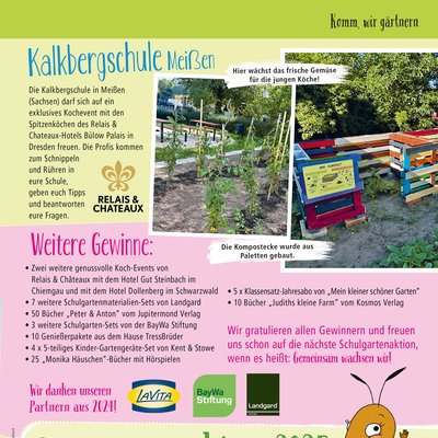 Die bundesweite Schulgartenaktion von Mein kleiner schöner Garten erfreut sich seit 2019 großer Beliebtheit in deutschen Grundschulen. Die Bewerbungen sind immer wieder zahlreich und unglaublich kreativ. Eine Fachjury hat die Gewinner-Schulen gekürt. Vorgestellt werden einige der Gewinner-Schulgartenprojekte in der Ausgabe 1/2025 von Mein kleiner schöner Garten, die heute (10.1.2025) erscheint.