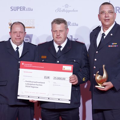 Mit weiteren Ehrenpreisen würdigte die Goldene Henne-Jury in den Kategorien „Charity“ und „Politik“ herausragendes gesellschaftliches Engagement. In diesem Jahr sind die Preisträger in der Kategorie „Charity“ drei Feuerwehrmänner aus Mecklenburg-Vorpommern. Sie standen stellvertretend für die vielen freiwilligen Feuerwehrleute auf der Bühne, die bei jedem Einsatz ihr Leben riskieren, um Menschen zu retten: Uwe Pulss aus Zarrentin, Wolfgang Krause aus Wanzlitz und Stefan Geier aus Kummer. Sie gehörten zu den 3.000 Einsatzkräften, die im Juni unermüdlich und mit großem Einsatz den schweren Waldbrand bei Lübtheen im Landkreis Ludwigslust-Parchim bekämpften. Gerade in den letzten beiden Dürresommern hat sich gezeigt, wie wichtig die freiwillige Arbeit dieser Alltagshelden ist. Das Publikum in Leipzig ehrte die drei Feuerwehrmänner mit Standing Ovations und minutenlangem Applaus.