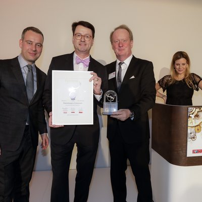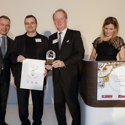 Die Chefredakteure Robert Schneider (Focus) und Thomas Wanka (Uhren-Magazin) überreichten den Vertretern der ausgezeichneten Hersteller ihre Preise. Die Goldene Unruh 2017 fand bei Ketterer Kunst in München statt, durch den Abend führte Sky-Moderatorin Viola Weiss.