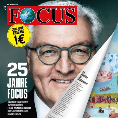 Anlässlich des Jubiläums hat Focus 25 Künstler gebeten, ein Cover zu gestalten. Darunter Ai Weiwei, Tobias Rehberger, Thomas Demand, Erwin Wurm, Anselm Reyle und Aino Laberenz. Bundespräsident Frank-Walter Steinmeier ziert das Cover der Jubiläumsausgabe. Ihn traf Focus zu einem Gespräch über die Lage Deutschlands. Auf dem Cover ist ein Umblättereffekt angedeutet: auf Steinmeier folgt Ai-Weiwei. Chefredakteur Robert Schneider sprach außerdem mit Verleger Hubert Burda über den historischen Moment vor 25 Jahren, also den Geburtsmythos von Focus. Des Weiteren dürfen sich die Leser über eine Kurzgeschichte von Hollywood-Star Tom Hanks freuen und ein Geburtstagsmenü von Starkoch Jamie Oliver, dem Anlass entsprechend aus 25 Zutaten. Vor allem nimmt Focus das Jubiläum aber zum Anlass, um in die Zukunft zu blicken: Wer sind die 25 Menschen, die uns in den nächsten 25 Jahren bewegen werden? Stimmen Sie hier über die Auswahl der Focus-Kollegen ab.