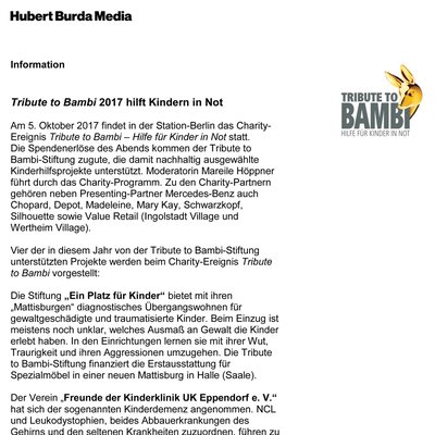 Neben der finanziellen Förderung unterstützt man die Arbeit der Projekte auch medial. Besondere Aufmerksamkeit erfahren sie beim Charity-Ereignis Tribute to Bambi, das in diesem Jahr am 5. Oktober in Berlin stattfindet. Moderatorin Mareile Höppner führt durch das Charity-Programm.