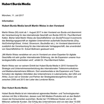 Martin Weiss (50) rückt ab 1. August 2017 in den Vorstand von Burda und übernimmt die Verantwortung für das internationale Geschäft von Burda-CEO Paul-Bernhard Kallen. Bisher leitet Martin Weiss als Geschäftsführer von BurdaPrincipal Investments das Beteiligungsgeschäft an digitalen Unternehmen außerhalb Deutschlands (Etsy, Notonthehighstreet, Vinted, Showroom, Baublebar etc.). Im Vorstand übernimmt er zusätzlich die Verantwortung für das internationale Verlagsgeschäft, das unverändert von Geschäftsführer Eckart Bollmann gesteuert wird.