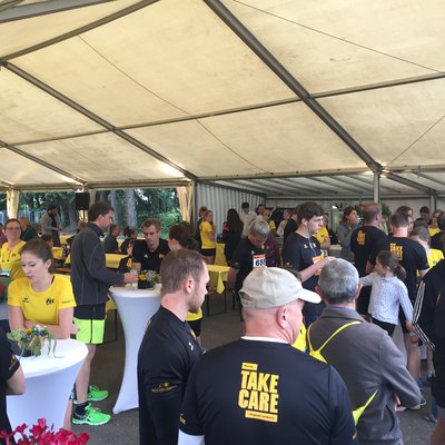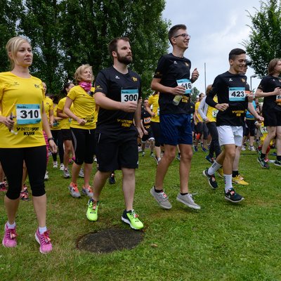 Jetzt stehe ich hier am Start. Um mich herum hunderte gelbe und schwarze „Burda läuft“-Lauftrikots. Es ist eine bunte Mischung an Burda-Mitarbeitern, die am Startpunkt warten – vom HR-Direktor über Geschäftsführer bis zu Praktikanten, sogar einige Kinder laufen mit.