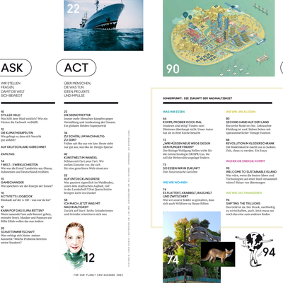 Der Aufbau des Hefts entspricht dem Dreiklang der Initiative des BurdaVerlags: ask, act, change. Es werden die richtigen Fragen gestellt, über Menschen, Ideen und Projekte berichtet und es werden Optionen vorgestellt, um Nachhaltigkeit als Lebensstil zu verankern. In der ersten Ausgabe als Stand-Alone widmet sich die Redaktion u.a. der Sängerin Billie Eilish, die zwei NGOs auf Welttournee mitgenommen hat, um ihre und die CO2-Bilanz ihrer Fans zu verbessern. Im Magazinteil werden Menschen vorgestellt, deren Ideen und Projekte inspirieren. Darunter Jade Bothma, die mit 16 Jahren eine Initiative gegründet hat, um die Meere von Plastikmüll zu befreien, und der argentinische Künstler Thomàs Saraceno, der mit seinen Solarballons ein neues Mobilitätskonzept für die Luftfahrt vorlegt. Der dritte Teil des Magazins will Leser:innen dabei helfen, selbst etwas zu bewegen für eine gerechte und nachhaltige Welt.