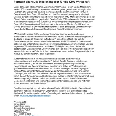 Unter der neuen Medienmarke „wir.unternehmen“ plant Hubert Burda Media zum Herbst 2023 den Einstieg in ein neues Medienangebot gemeinsam mit regionalen Partnern. Die Zielgruppe sind die kleinen und mittleren Unternehmen (KMU) in Deutschland. Zum Geschäftsaufbau und der Partnergewinnung wurde ein Joint Venture zwischen BurdaDruck und der im regionalen KMU-Markt erfahrenen Beranek Glandt Enterprises GmbH gegründet. Bereits Ende 2023 sollen erste Partnerregionen in den Markt einsteigen und sukzessive weitere Regionen erschlossen werden. Die Geschäftsführung des Joint Ventures „wir unternehmen Medien GmbH“ wird von Gerald Beranek (Co-Geschäftsführer Beranek Glandt Enterpises GmbH) und Ingo Raab (Leiter Sales & Business Development BurdaDruck) übernommen.