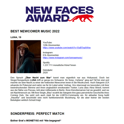 „LUNA hat die Bunte New Faces-Jury auf ganzer Linie überzeugt. Ihre wunderschöne Stimme berührt auf Anhieb und sorgt für Gänsehaut-Momente. Ihre Texte sind ehrlich, direkt, emotional und haben eine große Wirkung. Die Künstlerin braucht kein verrücktes Outfit oder eine wilde Bühnenshow, um alle in ihren Bann zu ziehen. LUNA braucht nur LUNA sein, um alle zu verzaubern. Zum ersten Mal in der fünfjährigen Geschichte des New Faces Award Music vergeben wir einen weiteren roten Panther an Nachwuchs-Musiker:innen. Mit dem Sonderpreis ‚Perfect Match‘ ehren wir eine Kollaboration zwischen jungen und etablierten Musiker:innen, die ganz besonders miteinander harmonieren. Genau das verkörpern Esther Graf & Monet192, die mit ihrem gemeinsamen Titel für einen gewaltigen Ohrwurm sorgen.“
