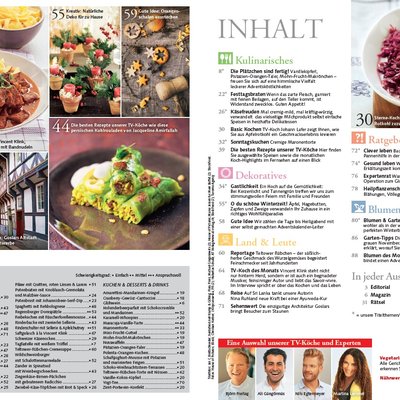 Gabriele Mühlens Highlights der Erstausgabe: „Unsere Plätzchen sind wirklich köstlich! Wir starten mit Johann Lafer eine Serie mit Klassiker-Rezepten, Cynthia Barcomi gibt Back-Pannen-Tipps, Natalie Lumpp präsentiert passende Weine, Martina Lammel bastelt, Melanie Wenzel verrät Rezepte aus der Naturapotheke … lesenswert ist auch das Interview mit Sternekoch Vincent Klink, einem der beliebtesten TV-Köche, feinsinniger Autor, begnadeter Jazzer und bodenständiger Schwabe, der das Savoir-Vivre liebt. Er sagt: ‚Genuss ist Ausdruck von Menschlichkeit.’ Und das ist ganz im Sinne unseres Claims ‚Kochen. Genießen. Leben’.“