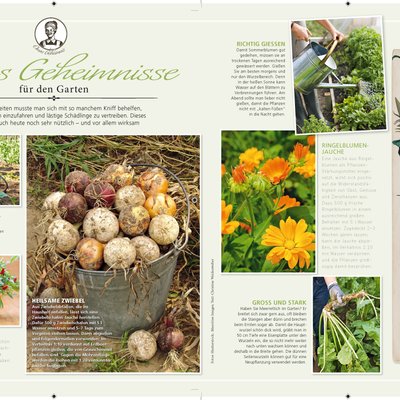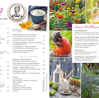 Ob Anbau- und Erntetipps für den Kräutergarten, wirkungsvolle Maßnahmen gegen Schnecken, alte Erdbeersorten für leckere Rezepte, Holzschutz aus der Natur, der Alleskönner Natron, das alte Hausmittel Apfelessig oder Omas kleine Wunderwaffen gegen Mückenstiche und Sonnenbrand – all das und vieles mehr erwartet die Leser in dem 116 Seiten starken Gartenidee-Sonderheft.