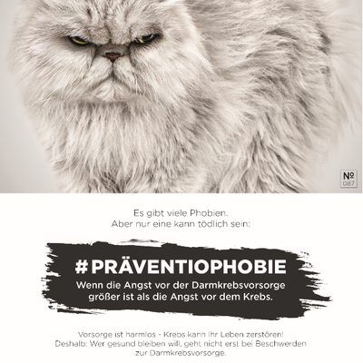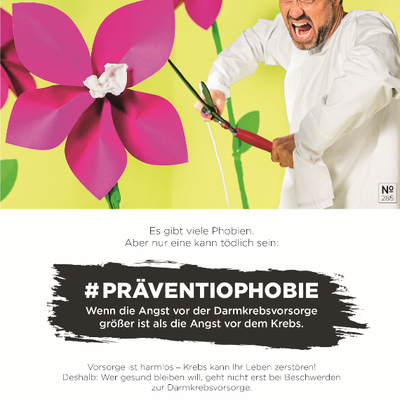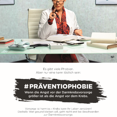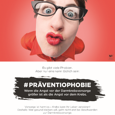 Die neu aufgehübschte Werbe-Kampagne der Stiftung macht über den erfundenen Terminus der „Präventiophobie“ augenzwinkernd auf Vorbehalte gegenüber der Vorsorge aufmerksam. Ängste nehmen oft skurrile Züge an und im Fall der Darmkrebsvorsorge können diese am Ende tödlich sein. Und die Kampagne wirkt!