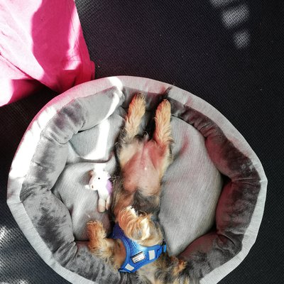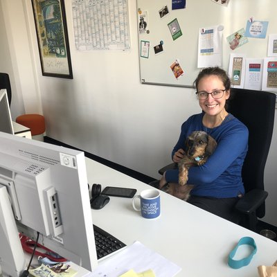 Ich bin eigentlich immer dabei und mit meinen fast eineinhalb Jahren sehr gut an das Büroleben gewöhnt. Morgens gehen wir immer 45 Minuten lang Gassi. Im Büro bekomme ich mein Frühstück und danach möchte ich erstmal schlafen. Wenn Kollegen im Zimmer sitzen, liege ich eigentlich lieber bei ihnen, denn die streicheln mich dann öfter als mein Frauchen. Mittags geh ich nur richtig gerne raus, wenn wir den Dackel Anton treffen. Mit dem spiele ich gerne! Ansonsten möchte ich nur kurz raus und dann gleich wieder rein.