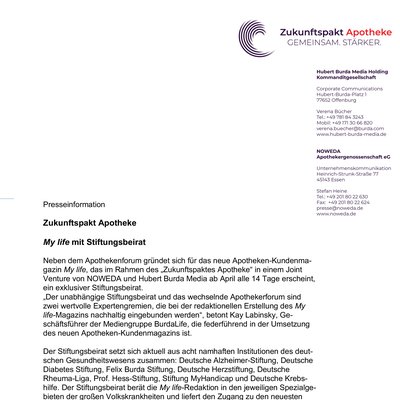 „Der unabhängige Stiftungsbeirat und das wechselnde Apothekerforum sind zwei wertvolle Expertengremien, die bei der redaktionellen Erstellung des My life-Magazins nachhaltig eingebunden werden“, betont Kay Labinsky, Geschäftsführer der Mediengruppe BurdaLife, die federführend in der Umsetzung des neuen Apotheken-Kundenmagazins ist.