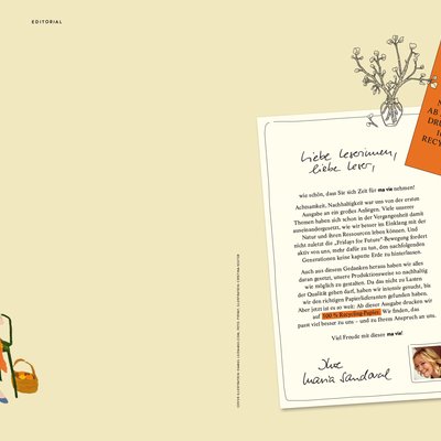 Nachhaltigkeit ist ein Thema, das sowohl die Leserinnen als auch die werbetreibende Industrie immer stärker bewegt. In der aktuellen Ma vie-Ausgabe, werden u.a. Menschen vorgestellt, die sich nachhaltig engagieren, um ihren Teil beizutragen, damit die Welt ein besserer Ort werden kann. In der Rubrik „Traum erfüllt“ erzählt Ma vie die Geschichte einer Frau, die von Berlin in die Bretagne zog und sich nicht nur neu ins Leben verliebte, sondern dort auch als Selbstversorgerin lebt. Es geht um sinnvolle neue Produkte und alte, denen per DIY-Tipps neue Bestimmungen gegeben werden. Auch via Social Media will Ma vie zu einem nachhaltigeren Lebensstil motivieren. Gemeinsame Nachhaltigkeits-Challenges mit den Ma vie-Leserinnen und -Userinnen sind geplant, bei denen die besten Tipps ausgezeichnet werden.