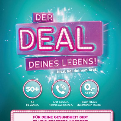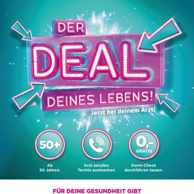 Mit einfachen, plakativen Bildern und Messages soll die Zielgruppe 50+ animiert werden, den „Deal Deines Lebens“ wahrzunehmen. Gemeint ist, der „Darm-Check“. Ganz bewusst wird der Begriff „Darmkrebsvorsorge“ sprachlich reduziert.