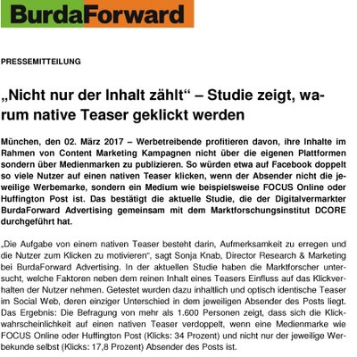 Werbetreibende profitieren davon, ihre Inhalte im Rahmen von Content Marketing Kampagnen nicht über die eigenen Plattformen sondern über Medienmarken zu publizieren. So würden etwa auf Facebook doppelt so viele Nutzer auf einen nativen Teaser klicken, wenn der Absender nicht die jeweilige Werbemarke, sondern ein Medium wie Focus Online oder Huffington Post ist. Das bestätigt die aktuelle Studie, die der Digitalvermarkter BurdaForward Advertising gemeinsam mit dem Marktforschungsinstitut DCORE durchgeführt hat. Sonja Knab, Director Research & Marketing bei BurdaForward Advertising, stellt die Studie kommende Woche auf der CMCX, der Content Marketing Konferenz in München (7./8. März) vor und erklärt uns vorab die wichtigsten Erkenntnisse:
