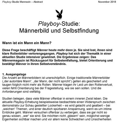 Playboy hat sich in einer aktuellen Studie, die von [m]SCIENCE GmbH in Zusammenarbeit mit Media Market Insights GmbH im Auftrag der Playboy Deutschland Publishing GmbH durchgeführt wurde, intensiv mit den Fragen auseinandergesetzt, welche Männerbilder aktuell vorherrschen und welche Funktion Playboy bei der Selbstfindung des Mannes spielen kann.