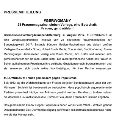 Frauenmagazine setzen sich heute mit gesellschaftlich relevanten Themen auseinander, haben Anteil an der Meinungsbildung und lassen sich nicht auf Mode-, Beauty- und Kochtipps reduzieren. Die außergewöhnliche Aktion #Gerwomany soll Frauen ihre politische Gestaltungsmacht bewusst machen und sie animieren, sich durch aktive Wahlbeteiligung für ihre Rechte einzusetzen. Gegen Populismus haben wir nur eine Wahl: Wählen gehen! So lautet das gemeinsame Credo von #Gerwomany. Über die 23 Frauenmagazine der sieben Verlage werden damit über 20 Millionen Leserinnen in Deutschland erreicht. Mit dabei sind die BurdaStyle- und BurdaLife-Titel Donna, Elle, Freundin, Harper‘s Bazaar, Instyle, Lisa, Lust auf mehr und Ma vie.