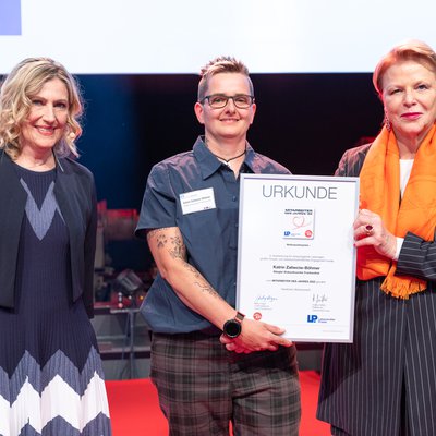 Mitarbeiterin des Jahres 2022 in der Kategorie „Endverbraucher": Katrin Zaliwciw-Böhmer_Edeka Stiegler in Frankenthal. (links Gaby Höger_Chefredakteurin Meine Familie & ich, rechts Unterstützerin Prof. Dr. Ulrike Detmers) © Peter Eilers für Lebensmittel Praxis/Meine Familie & ich